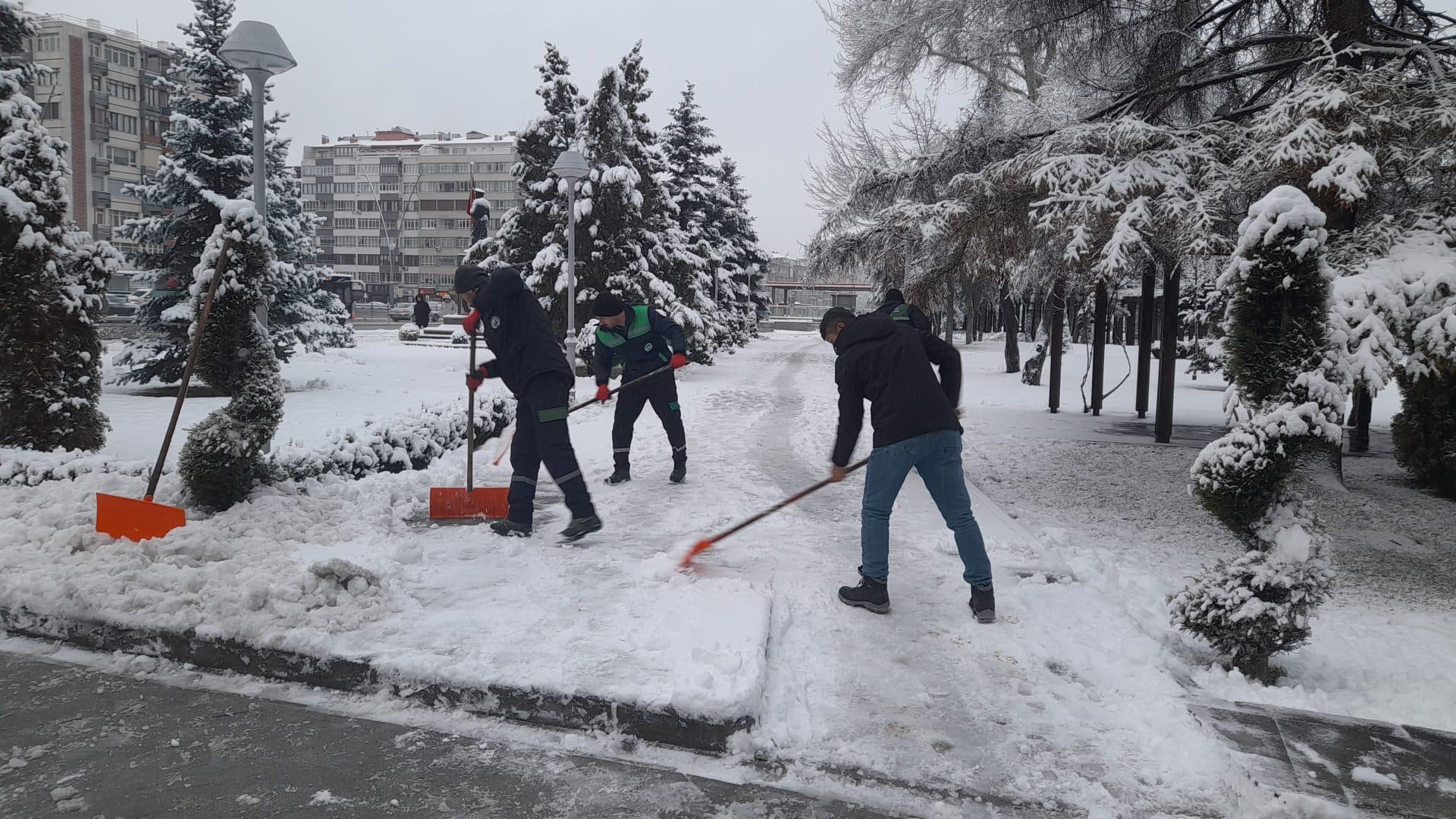 Park ve Bahçeler Daire Başkanlığı ekipleri de 72 personel ile yaya yolları ve kaldırımlarda kar temizliği çalışmaları yaparak vatandaşların güvenliğini sağlıyor.