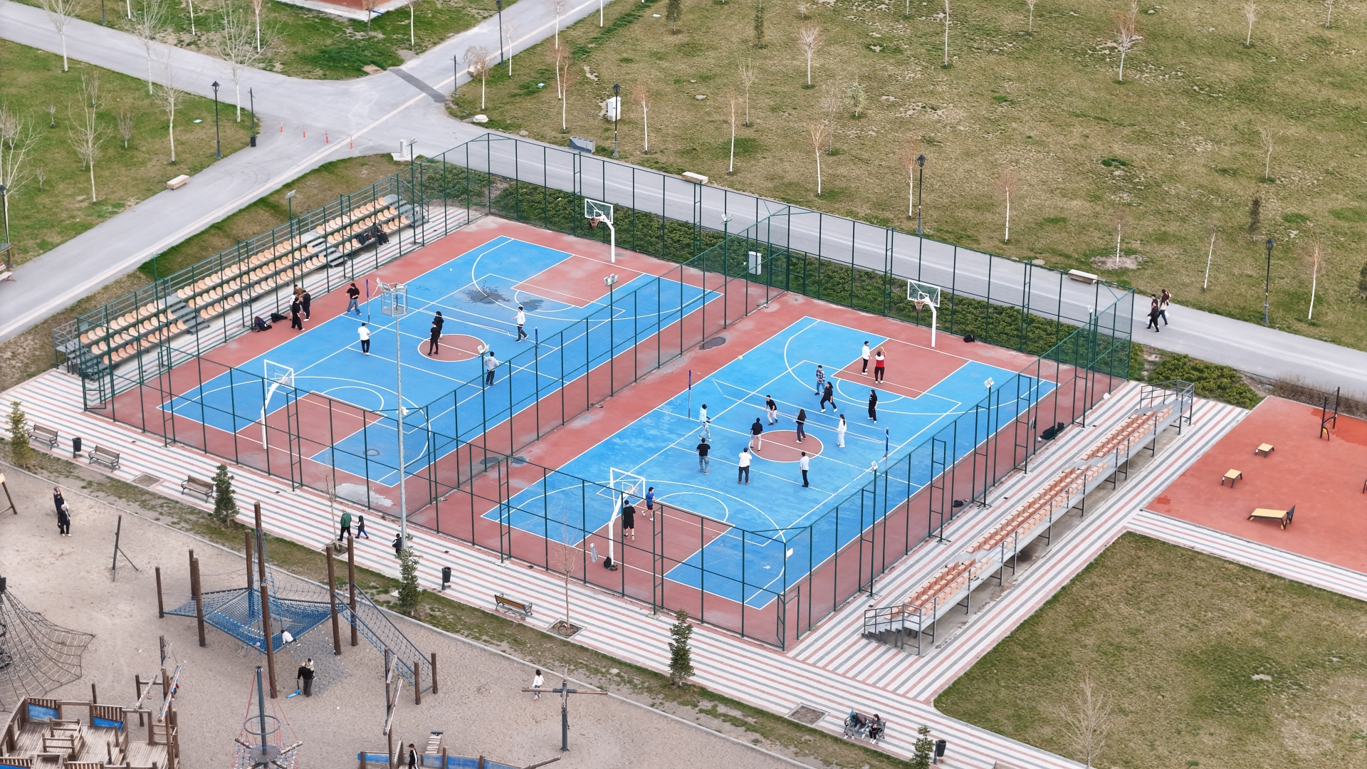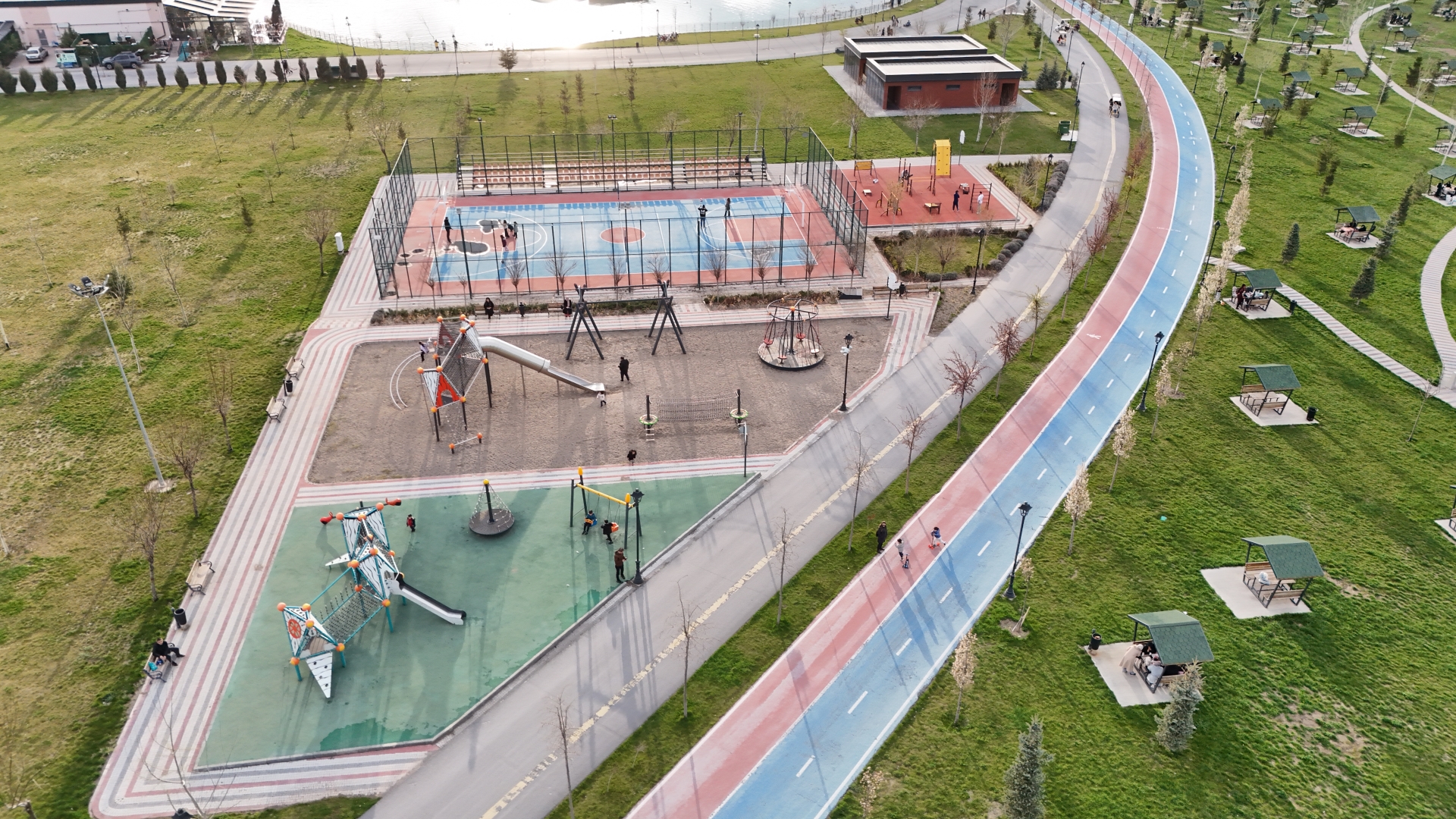 oyun alanları, spor sahası alanları ile süs havuzları bulunuyor.